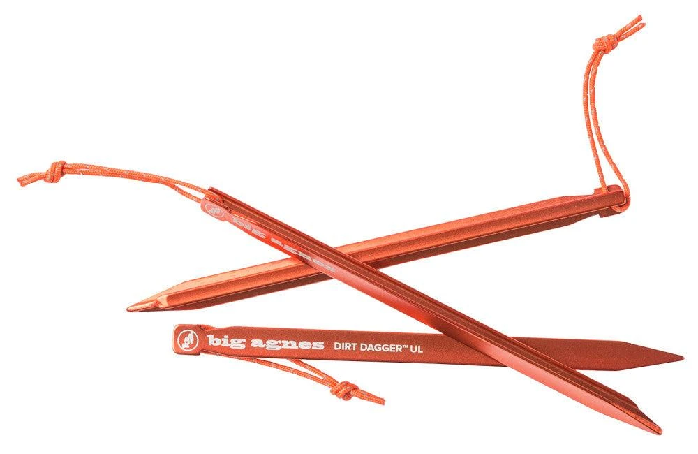 Dirt Dagger UL Tent Stakes are available in select tent models and sold separately in three sizes, 6” for ultralight tents, 7.5” for superlight setups, and 10” for car camping and shelters.