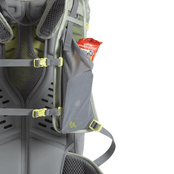- Oversized stretch-mesh quick stash pocket on front, side, and on chest straps for easy drop-in storage