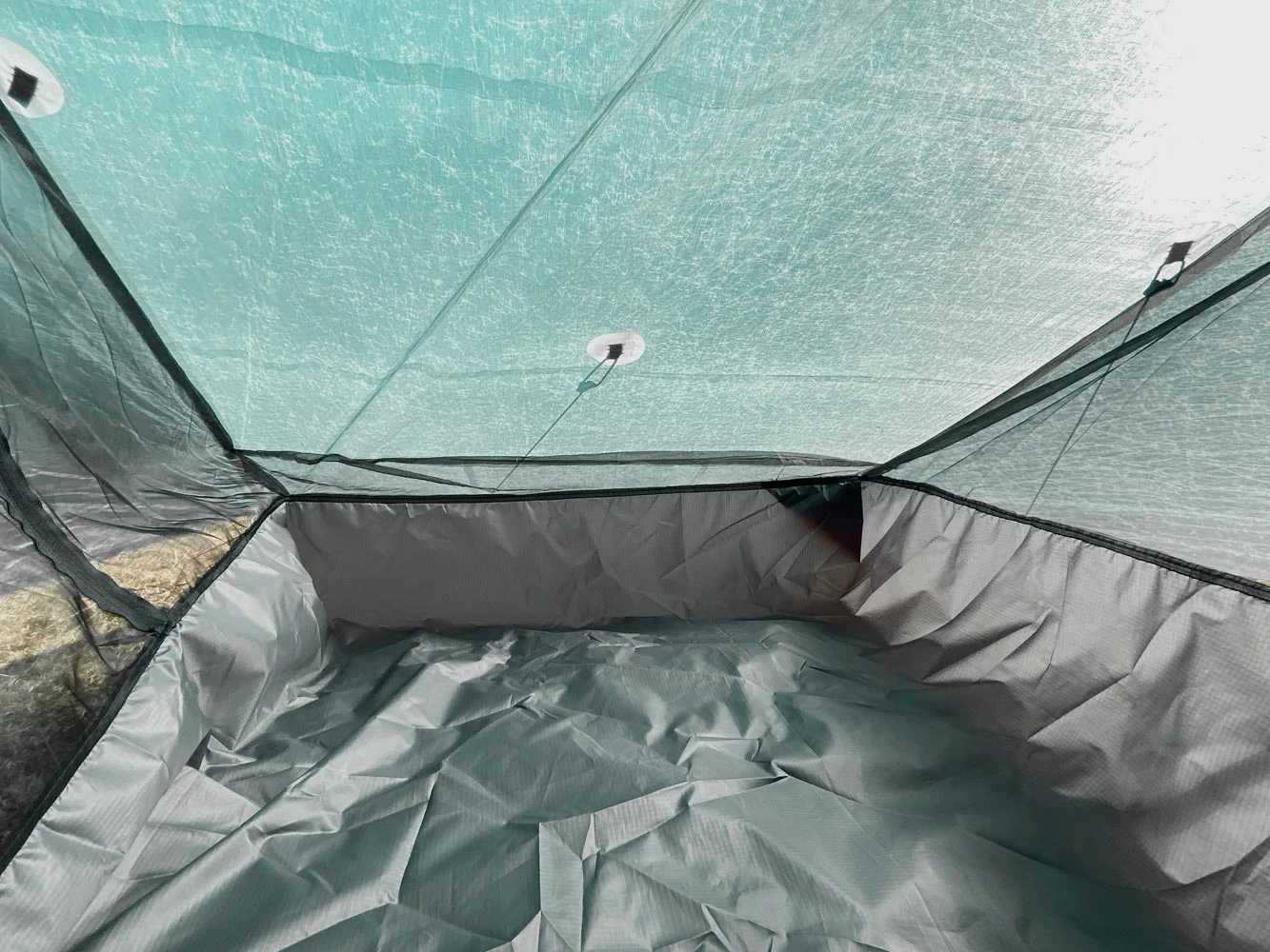 - The mosquito net is integrated on the inside of the tent and stitched to the tent body to protect you from insects and mosquitoes. Inside the tent there is a mesh storage pocket and two hanging points for drying clothes, hanging headlamps and more.