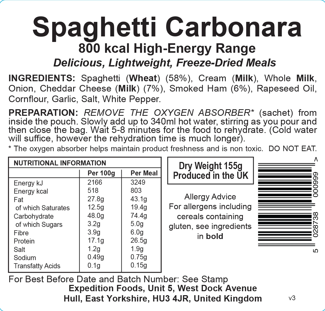 Spaghetti alla carbonara is an Italian pasta dish created in a traditional way with spaghetti, cheese and smoked ham sprinkled with just the perfect amount of salt and white pepper. One of the best-selling Expedition Foods meals, this meal can be eaten anywhere and anytime of day. A meal meant to satisfy for any occasion or weather condition while taking part in a backyard micro-adventure or bikepacking around the island. Just add hot water, stir and wait five minutes. What a meal!