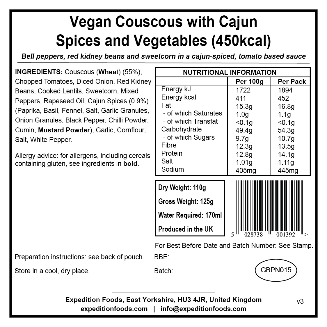 INGREDIENTS: Couscous (Wheat) (55%), Chopped Tomatoes, Diced Onion, Red Kidney Beans, Cooked Lentils, Sweetcorn, Mixed Peppers, Rapeseed Oil, Cajun Spices (0.9%) (Paprika, Basil, Fennel, Salt, Garlic Granules, Onion Granules, Black Pepper, Chilli Powder, Cumin, Mustard Powder), Garlic, Cornflour, Salt, White Pepper.