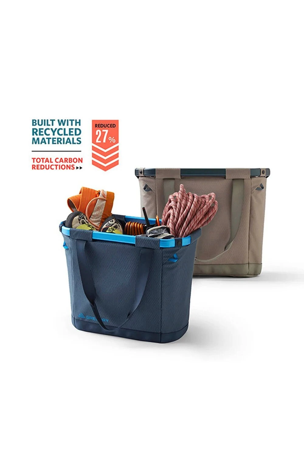 A gear tote designed for quick and easy access, made with a collapsible, aluminium frame, connected to a flexible base for durability and protection.