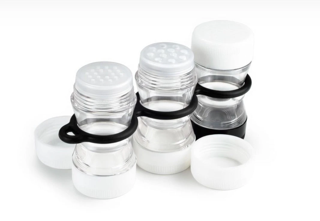 Ultralight set conveniently links up spice containers providing up to 6 different spice options with removable screens for easy refilling.