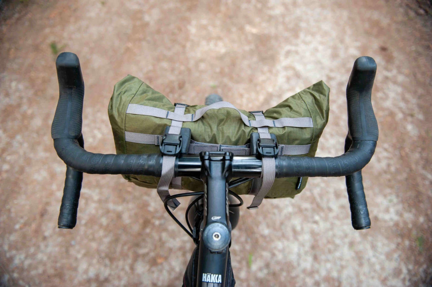 - Removable spacers ‘float’ the bag away from handlebars to free up real estate for hands or accessories, and a headtube bungee keeps things stable off-road.