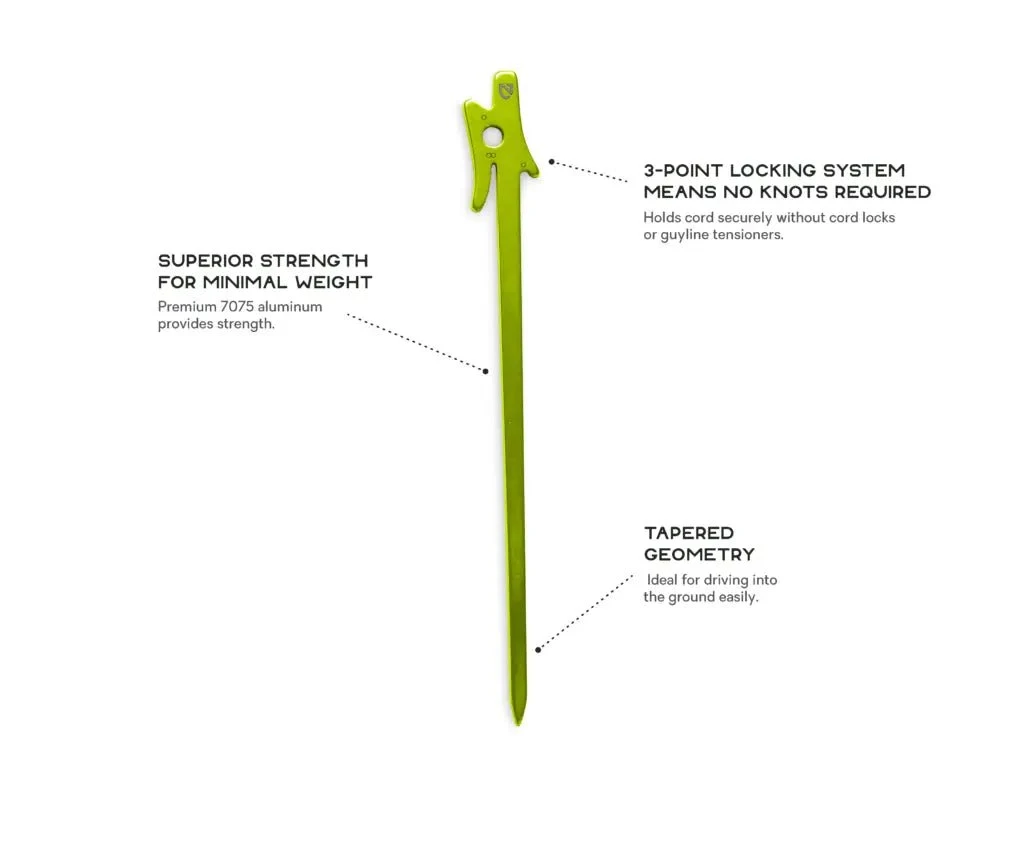 Nemo Airpin’s three-point locking system holds cord tight and eliminates the need for knots, cord locks, or guyline tensioners. The tapered geometry is ideal for driving into the ground and the 7075 aluminium offers superior strength for its minimal weight.
