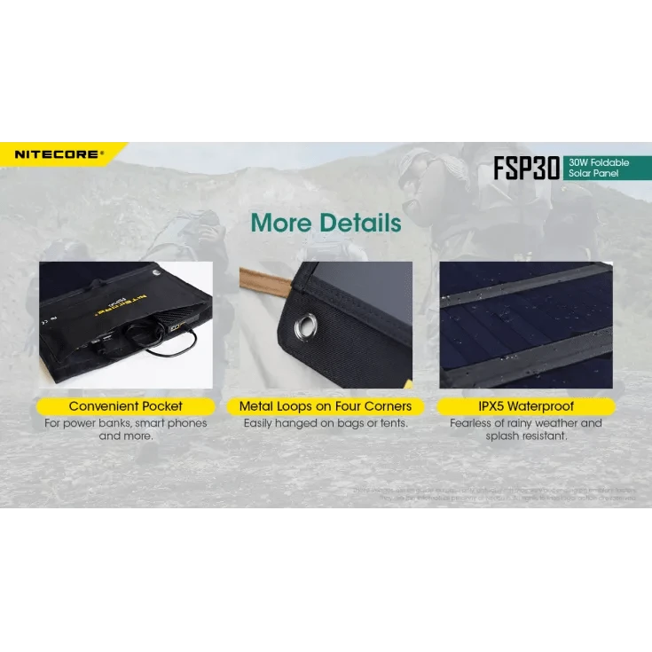 The Nitecore FSP30 foldable solar panel is an ideal addition to your outdoor adventures to keep your devices charged, including power banks, smartphones and flashlights. With an innovative design, it can be attached to a backpack whilst hiking or climbing, used whilst camping or attached to a bike.