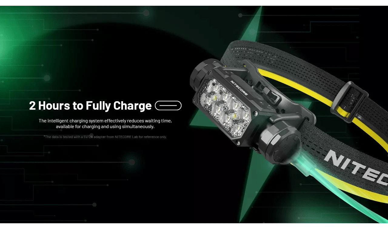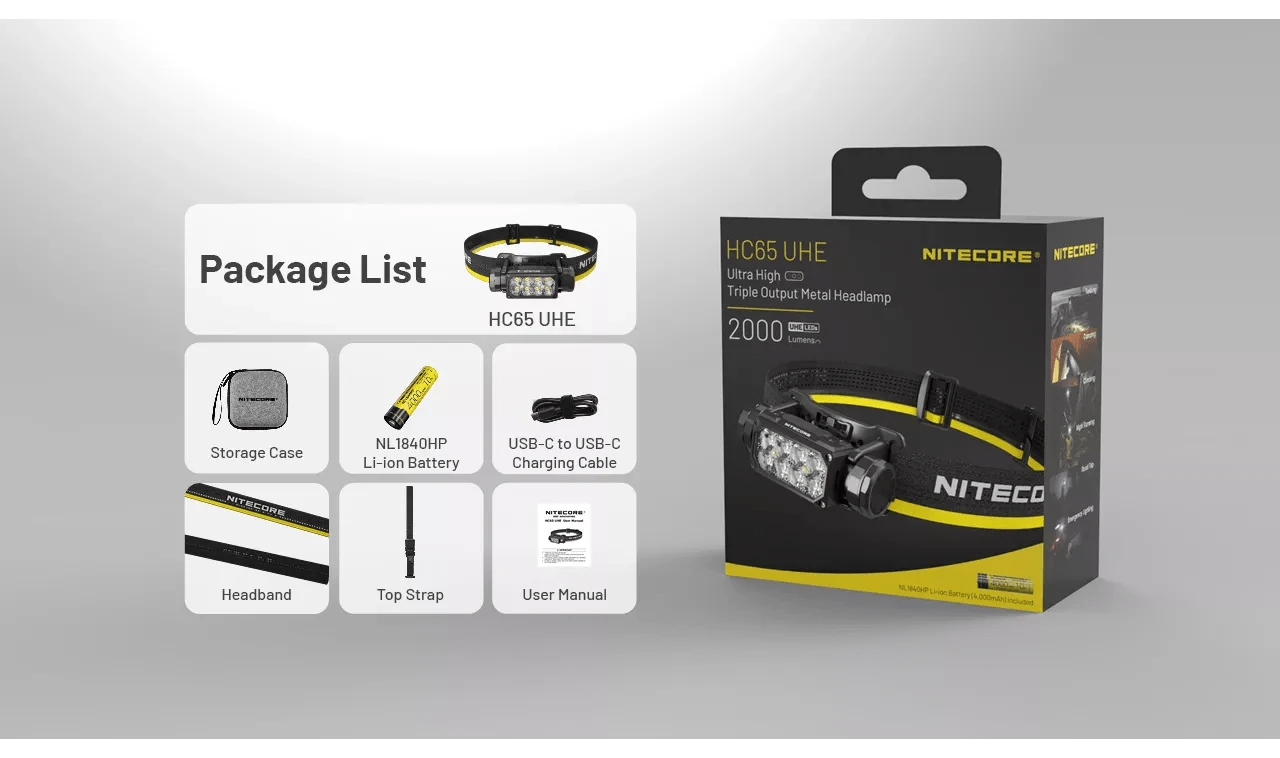 The Nitecore HC65 UHE headlamp has a maximum output of 2000 lumens from the 8 x NiteLab UHE LEDs and is powered by a high performance 18650 li-ion battery (included). It is rechargeable via USB-C and can be fully charged in as little as 2 hours.