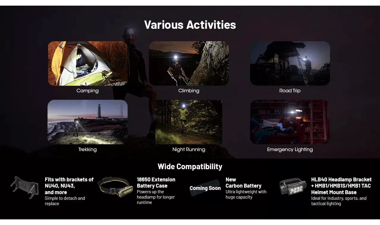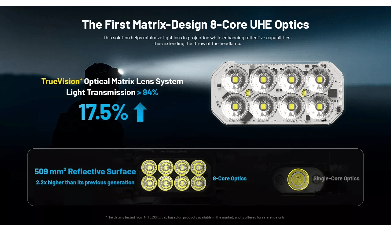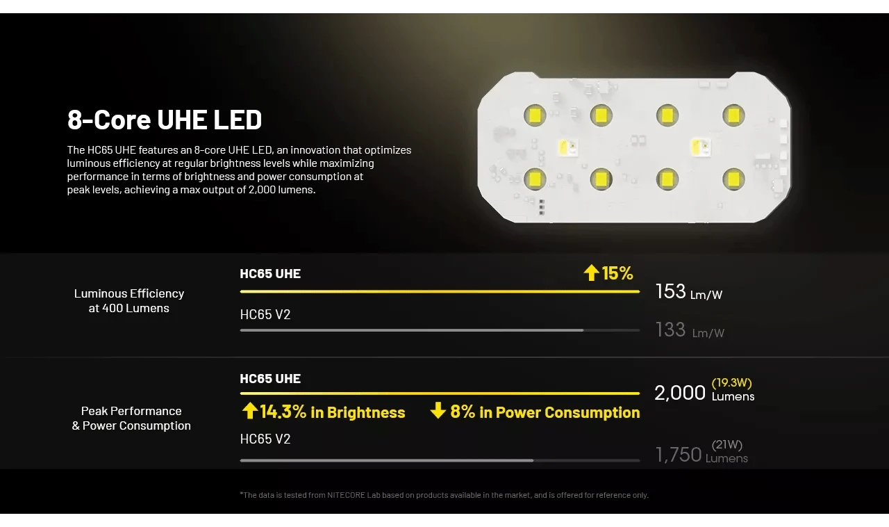 Short for Ultra High Efficiency, the UHE LED is the first of its kind and ensures enhanced efficiency per watt, offering a brighter, more energy-efficient and long-lasting experience. The 8-core UHE LED gives the HC65 UHE a 14.3% brightness increase and 8% decrease in power consumption compared to the Nitecore HC65 V2 headlamp, plus an improved beam distance by 34.5%.