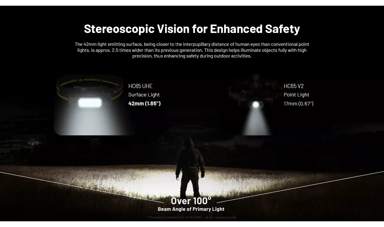 The HC65 UHE has a 42mm light emitting surface, approximately 2.5 times wider than its previous generation. This design helps illuminate objects fully with high precision, enhancing safety during outdoor activities.
