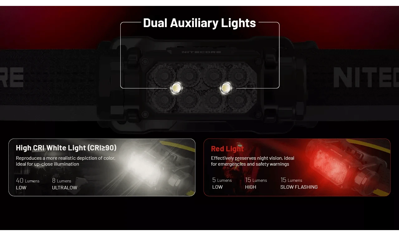 In addition to the 4 levels of primary white light, the headlamp offers dual auxiliary lights; a high CRI white light which produces a realistic depiction of colour and is ideal for close up illumination, plus a red light to preserve night vision and for use in an emergency.