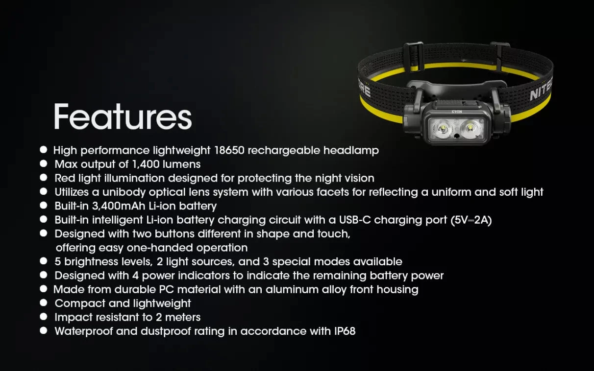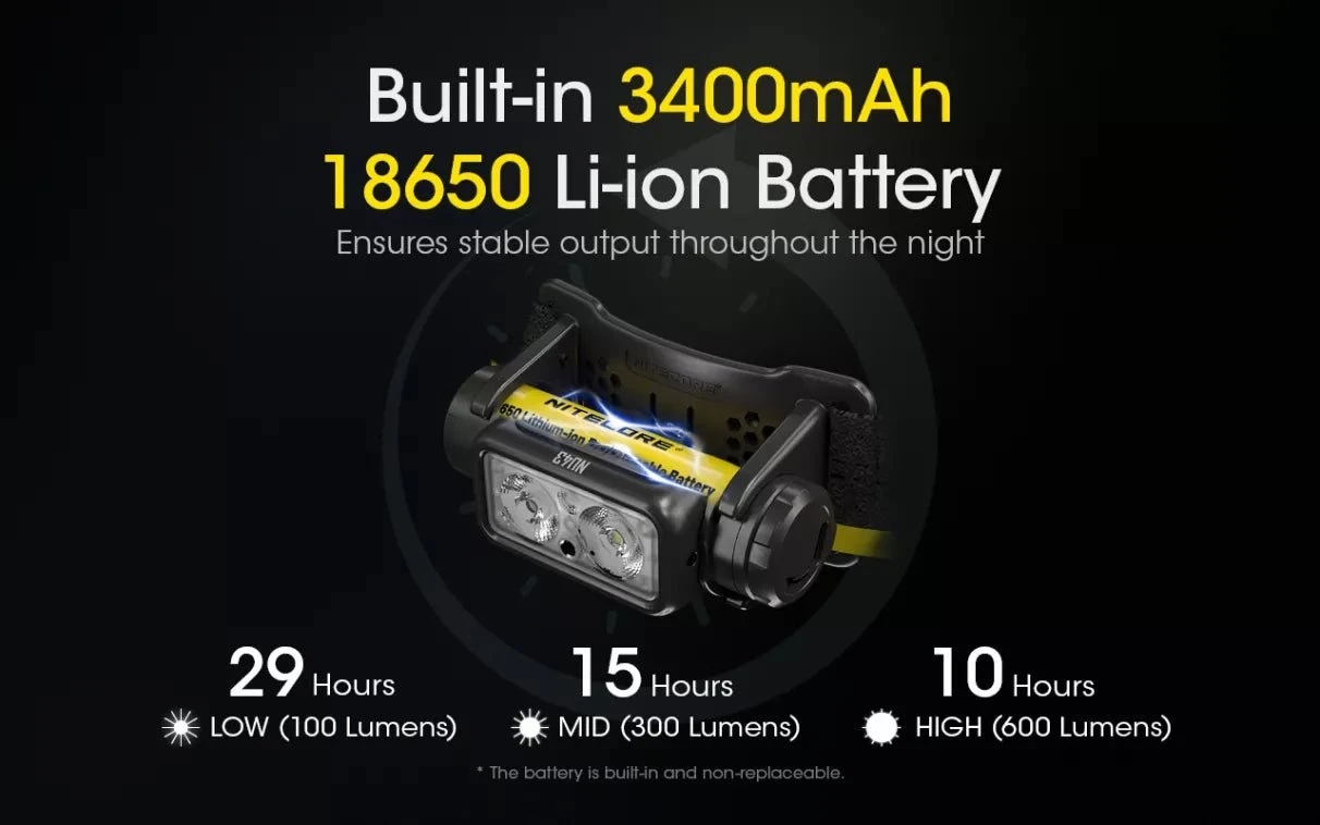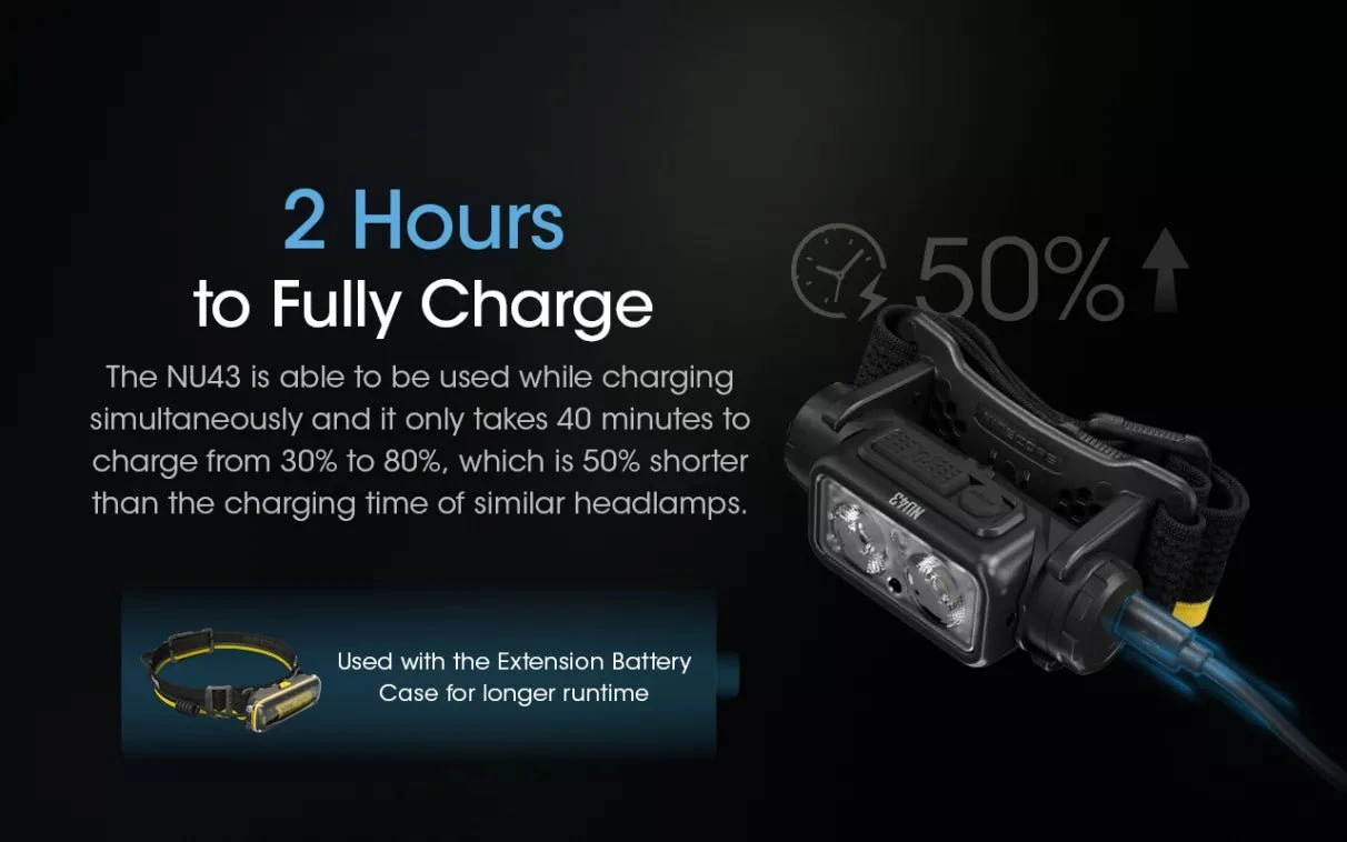 The Nitecore NU43 is the world’s lightest 18650 rechargeable head torch, weighing in at just 116 grams including the built-in 3400mAh battery. Despite its light weight the NU43 has an impressive maximum output of 1400 lumens. Charging is via USB-C port on the side of the light and a USB-C cable is included.