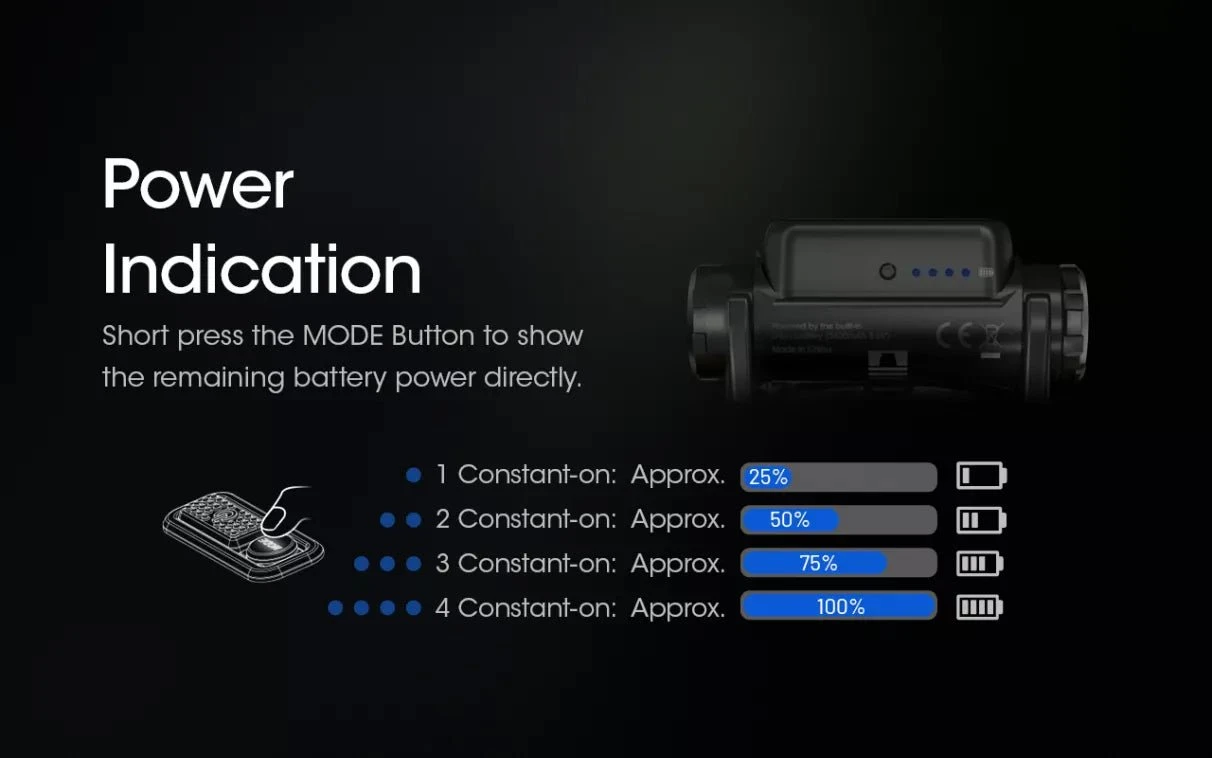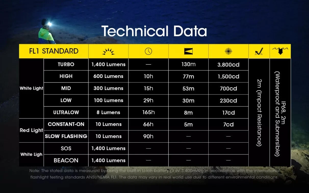 Advanced temperature regulation (ATR) regulates the output of the NU43 according to the working and ambient temperature to maintain optimal performance while preventing the LED from overheating. The outputs are measured in total of runtime, including output at reduced levels due to temperature or protection mechanisms in the design, causing the brightness level to drop down.