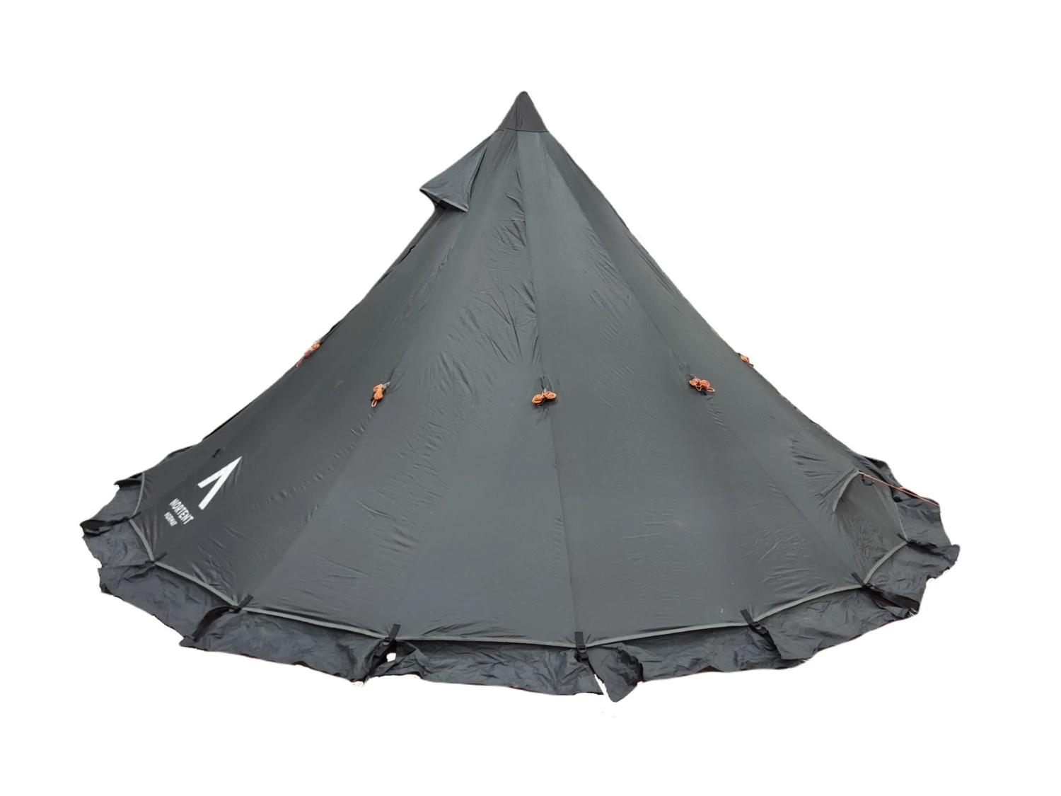 - Our tipi is lower than traditional designs to balance comfort with aerodynamics. With a height of 226 cm and a diameter of 426 cm, we’ve designed it with a steeper angle to direct wind up and around the tent, reducing pressure on the flysheet. Unlike standard tipis with 6 to 8 edges, ours features 20 reinforced fastening points along the flysheet, creating an aerodynamic cone shape that enhances stability in strong winds. The Silnylon flysheet ensures exceptional durability and weather resistance.