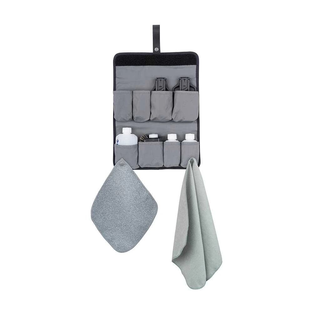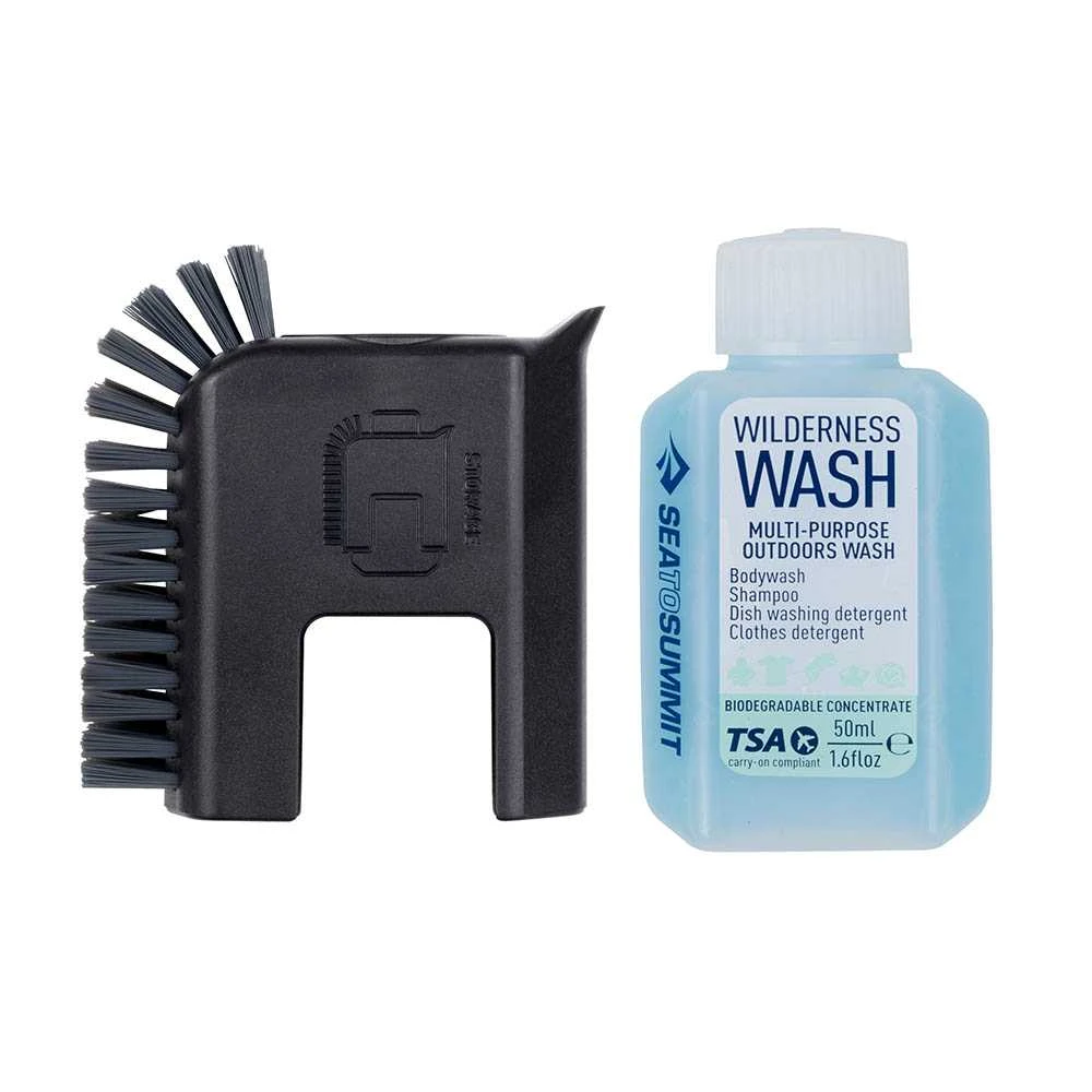 Cooking and cleaning kit for ultimate camp kitchen organisation. This 10-piece cooking and wash kit is made for your backcountry camp kitchen. Hang this compact kit in your camp kitchen and you’ll have most things you need on hand to create – and clean up after – gourmet outdoor meals. The kit contains everything from empty leakproof bottles for oils and condiments, to a folding spatula and serving spoon, to a pot scrubber, washcloth and dishcloth.