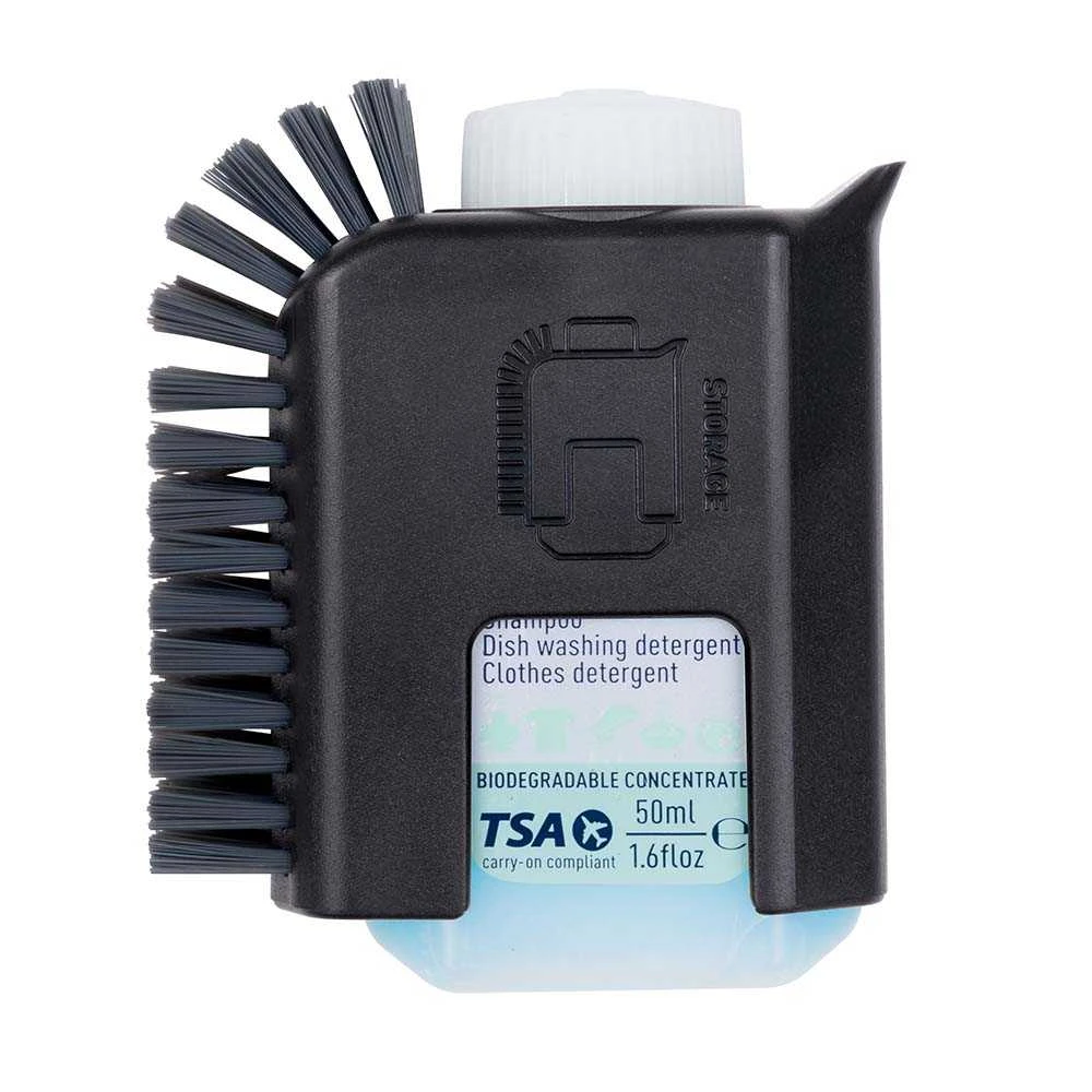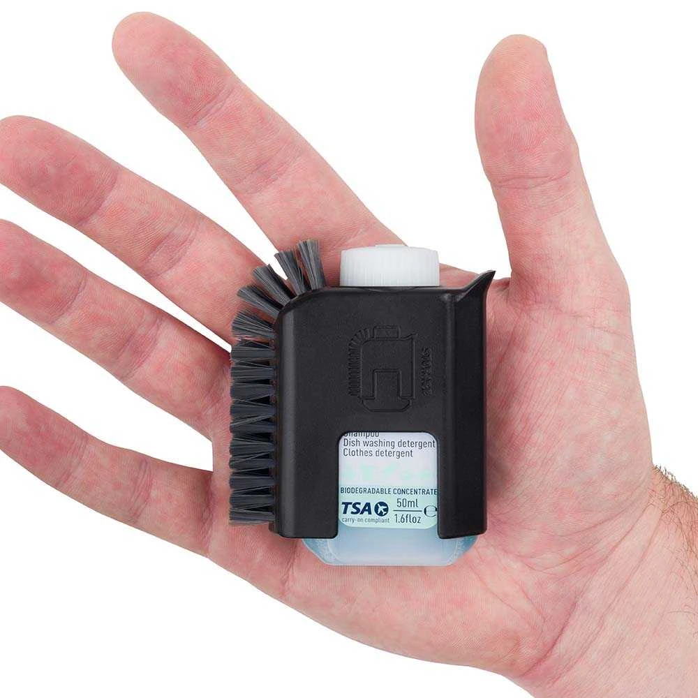 This handy and compact camp kitchen companion is the perfect tool for cleaning up after a meal. The Scrubber has tough nylon bristles and an ergonomic shape that fits in the hand and also contoured to match the angles of Sea to Summit pots, making washing up a breeze. Easy to hold, easy to use, the Pot Scrubber includes a 50ml bottle of Wilderness Wash ready to take on baked-on food residue from camp cooking. Nylon bristles and the integrated scraper mean your pots and tableware will be really clean – not just camp clean.