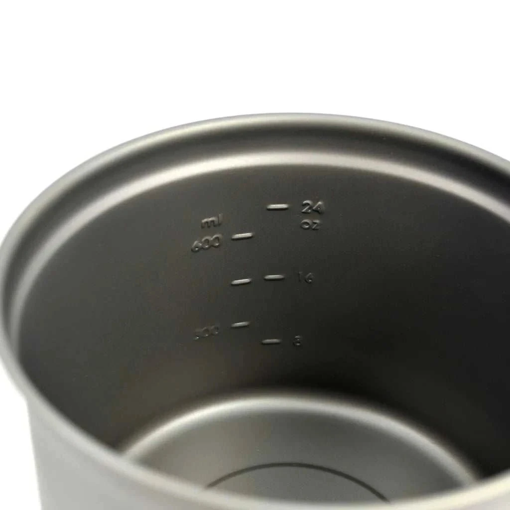 The TOAKS 900ml pots weigh only 116 g. It comes with our signature lockable-handled lid for your easy, safe handling, gradations in oz and ml, and a mesh storage sack.