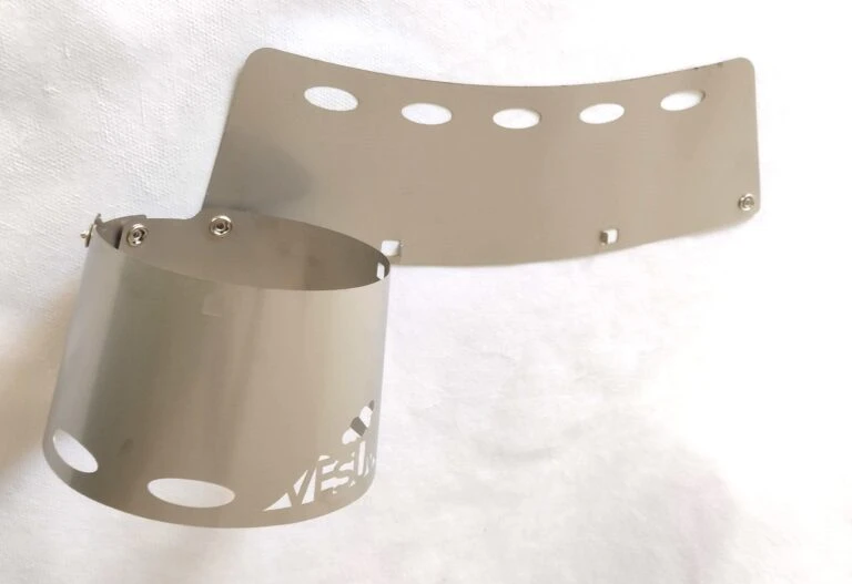 VESUV windshields for Toaks pots, provide more efficiency, stability and comfort while cooking outdoors with your titanium Toaks cooking pot and alcohol stove. Made from ultralight 0.1 mm titanium foil, the VESUV windshield is easy to use, and rolls up compactly with a velcro strap (included).